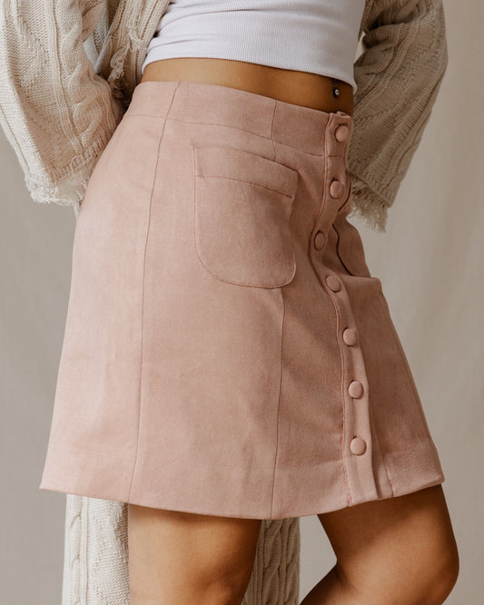 تنورة قصيرة من الجلد المدبوغ بأزرار باللون الوردي