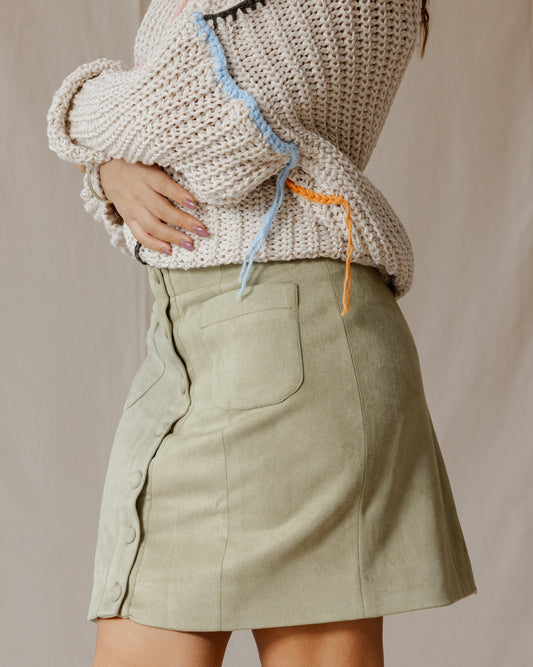 تنورة قصيرة من جلد سويدي بأزرار باللون الأخضر