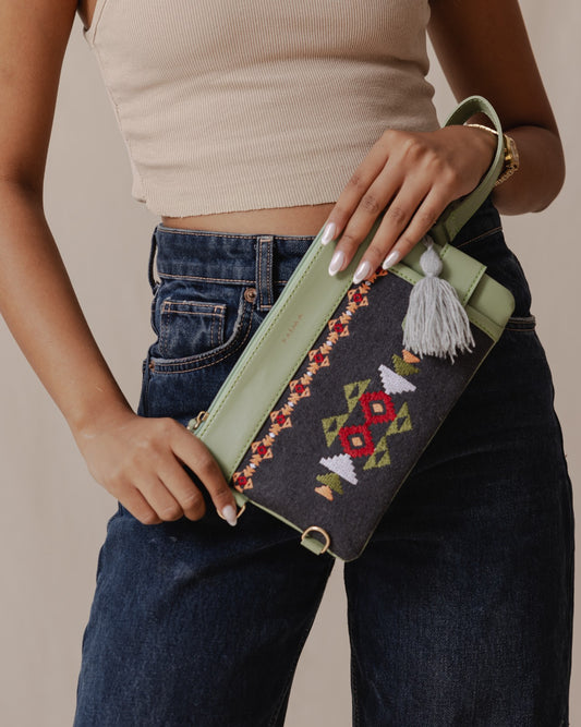 محفظة نسيج قبلية باللون الأزرق الداكن والفستقي