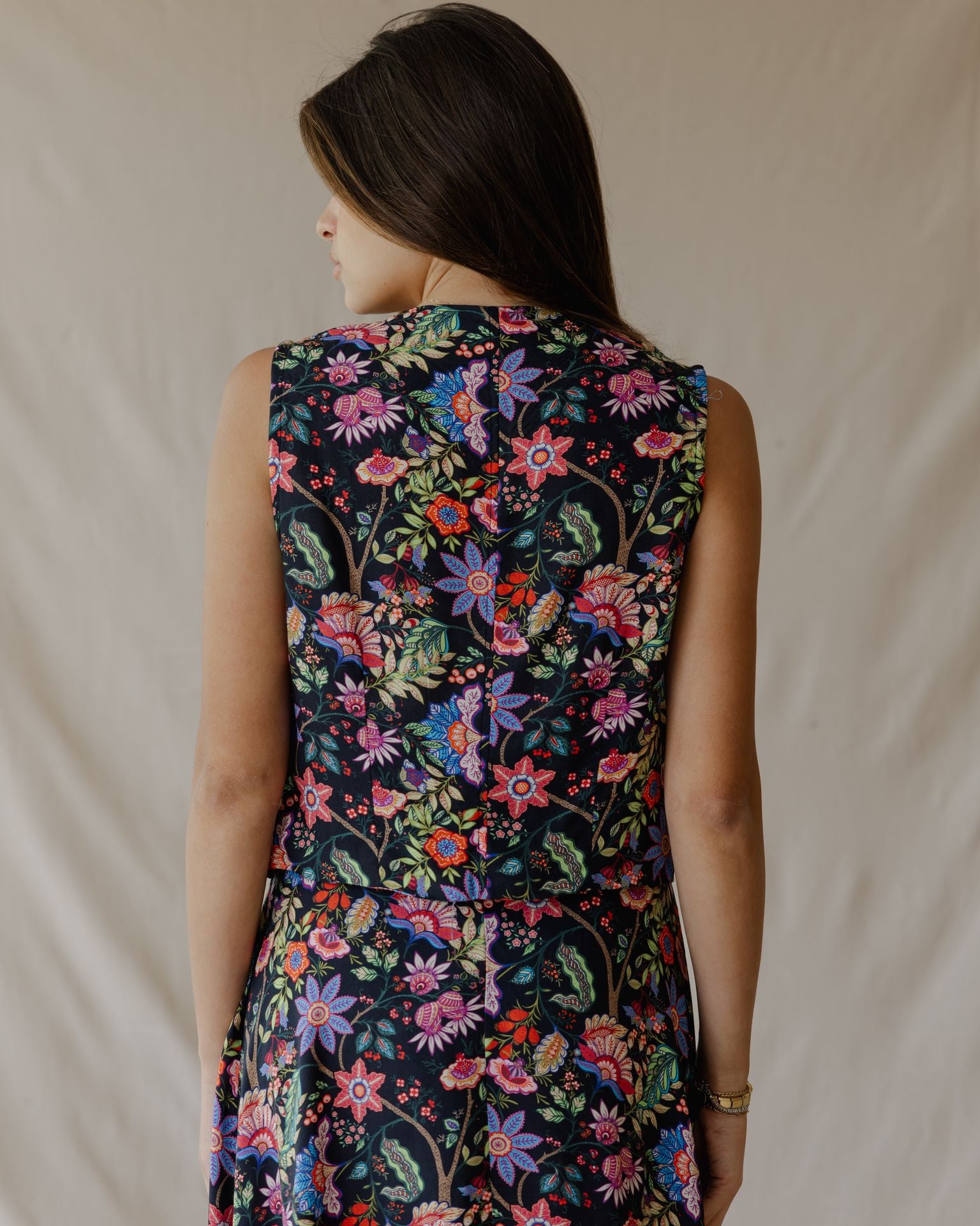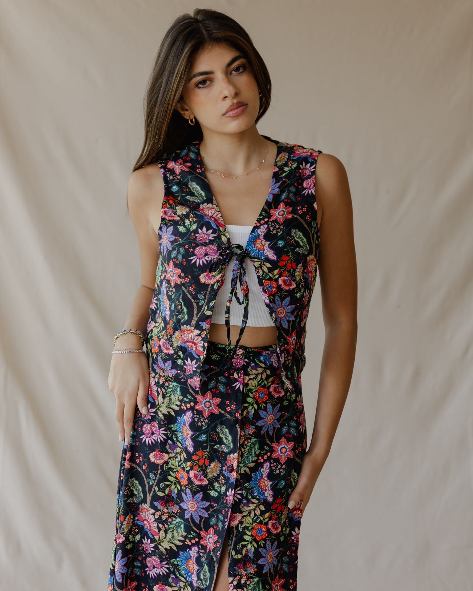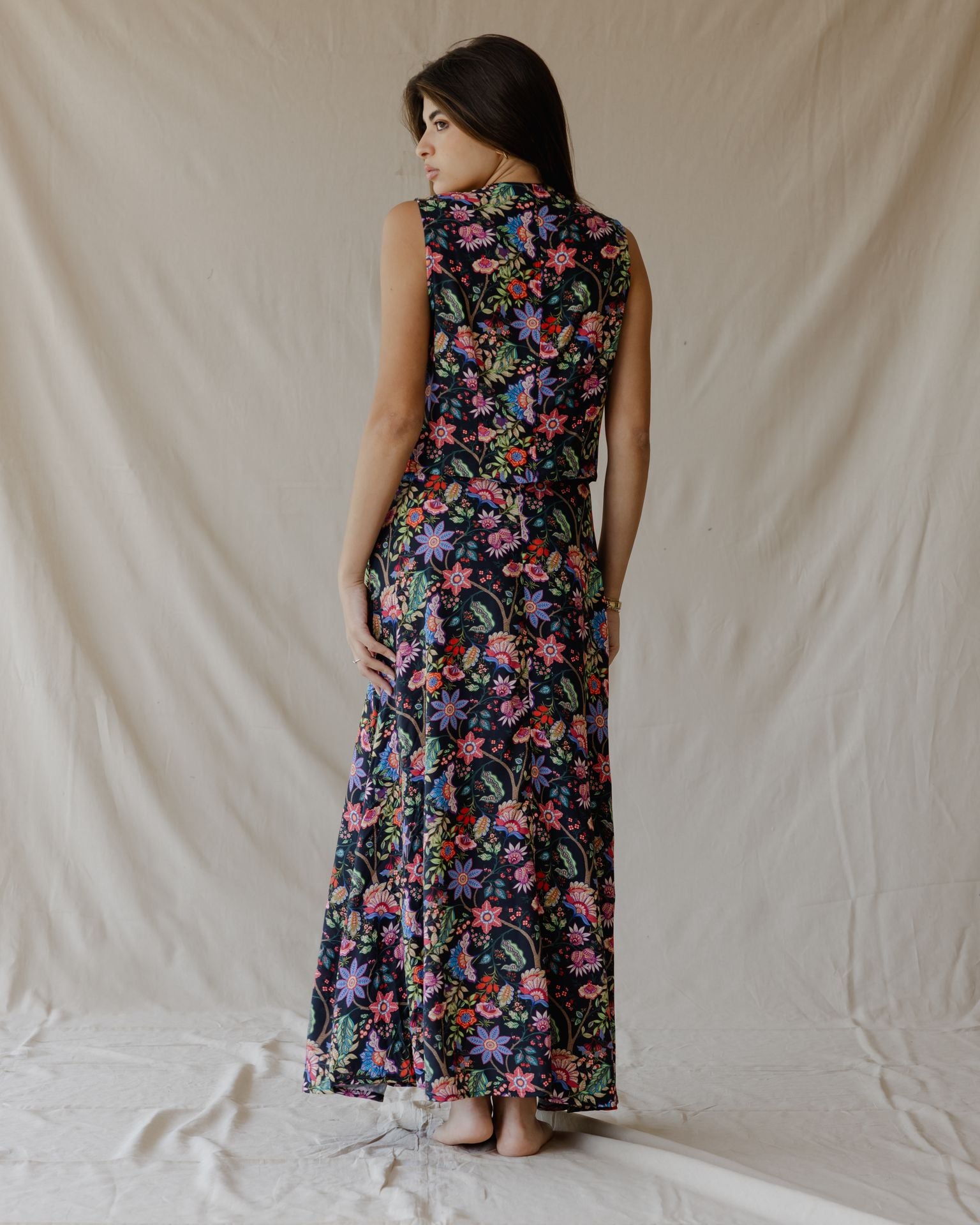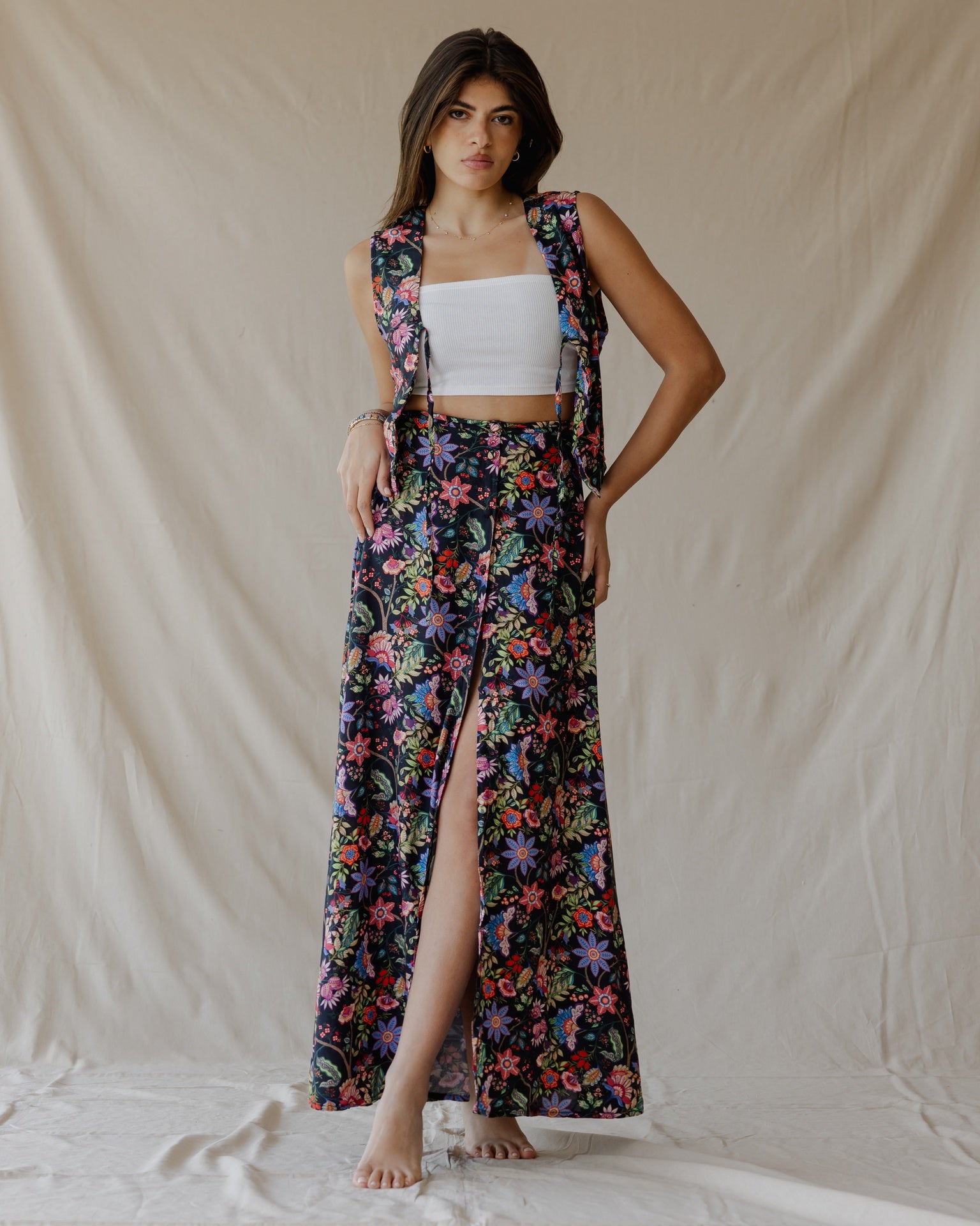 طقم مطبوع خفيف مصنوع من الفيسكوز الناعم، يتكون من سترة برباط وتنورة بأزرار، يمكنكِ تعديل طولها حسب رغبتكِ - أغلقي الأزرار بالكامل أو اتركي بعضها مفتوحًا. تصميم سهل وخفيف، وبسيط.