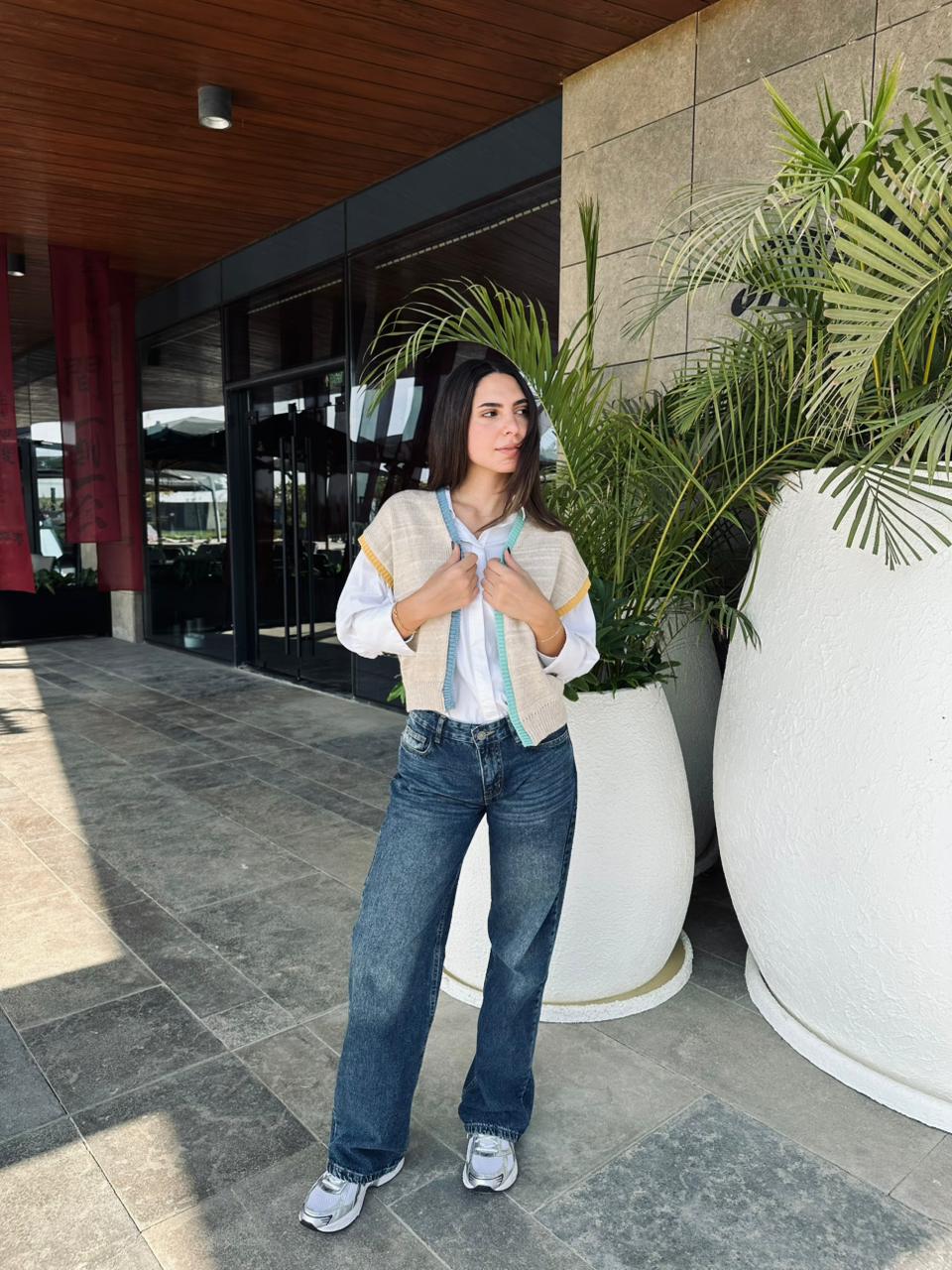 مستوحاة من الزخارف التقليدية، تجمع هذه السترة المحبوكة بين الألوان الدافئة والترابية. نسقيها مع تيشيرت بسيط أو فوق قميص لإطلالة عصرية خالدة.