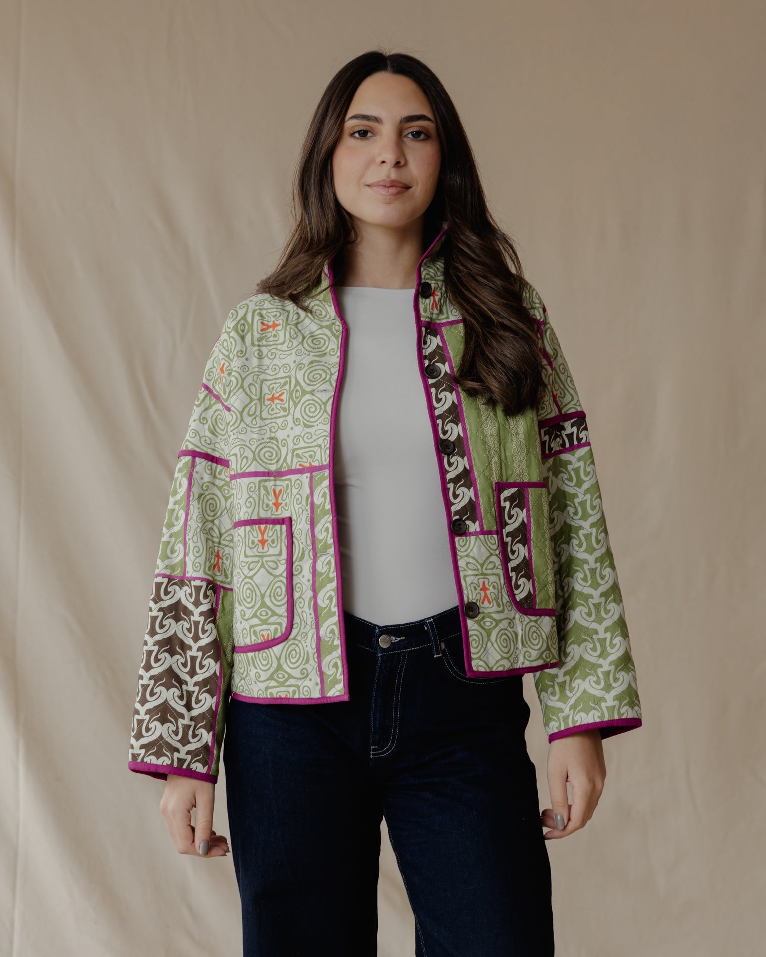 جاكيت مبطن بتصميم مريح، يتميز بإغلاق أمامي بأزرار، وحواف متباينة، وجيبين أماميين. مثالي للارتداء فوق طبقات أخرى ولإطلالة يومية أنيقة دون عناء.