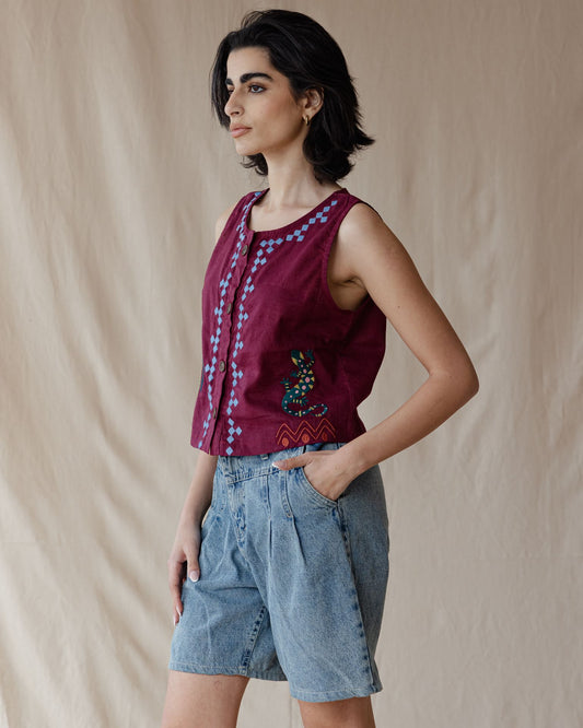 Sunflare Gecko Embroidered Vest Burgundy