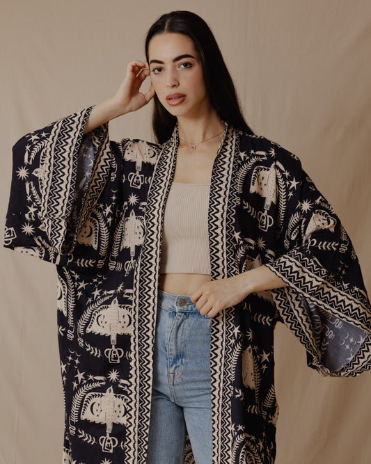 Boho Birds Cotton Kimono Black