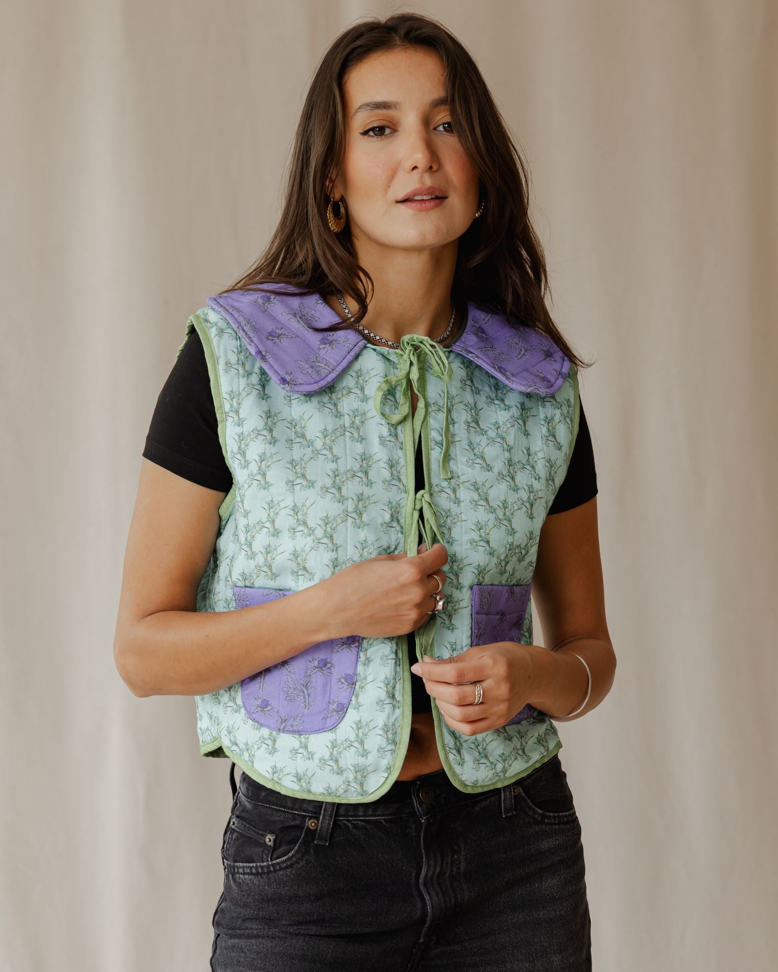 This charming quilted vest features a delightful leaf pattern, a contrasting collar and pockets, and a simple tie-front closure.