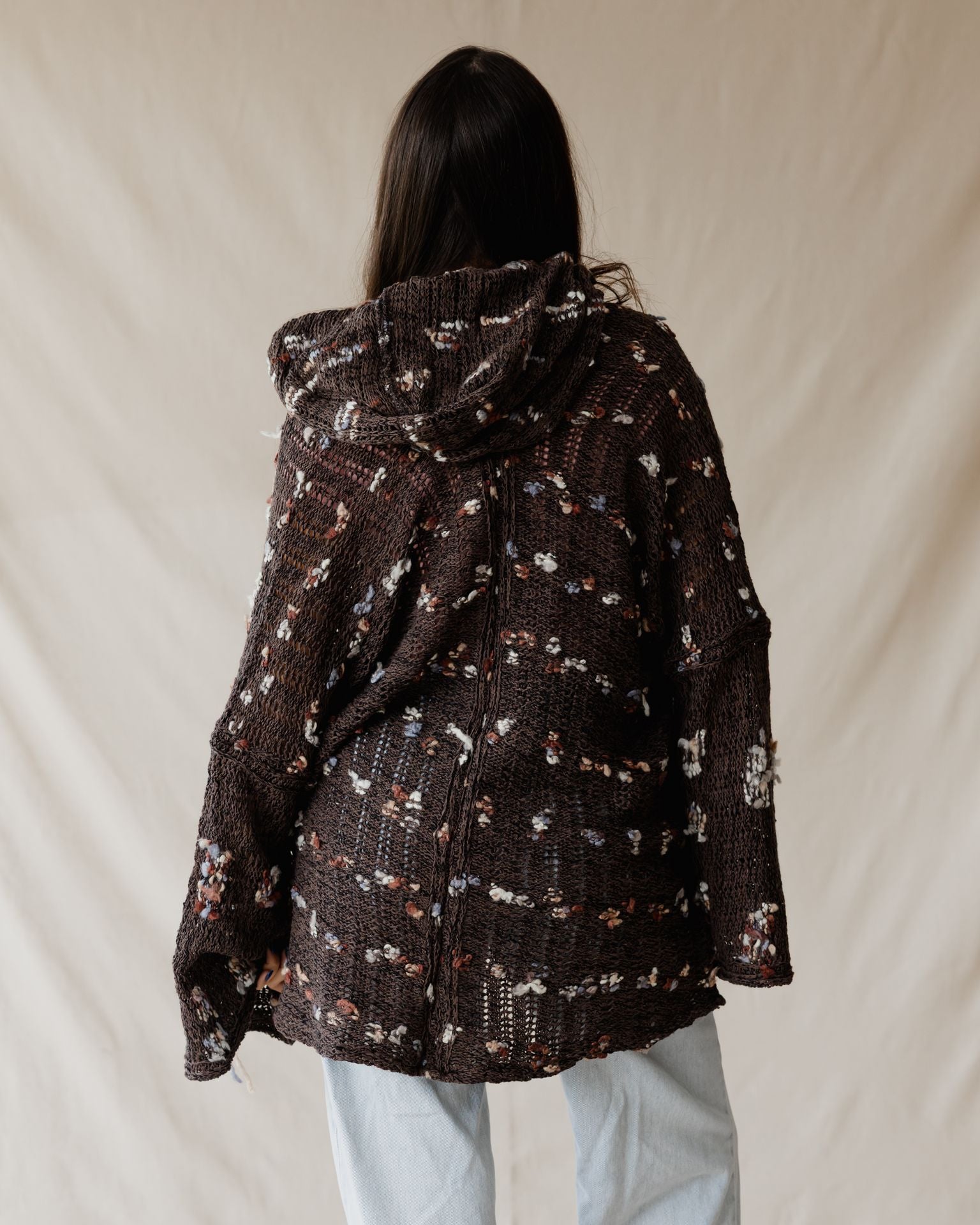 This oversized tricot hoodie offers a cozy, handmade vibe with its comfortable hood and relaxed fit, making it an ideal layering piece for the chillier months.