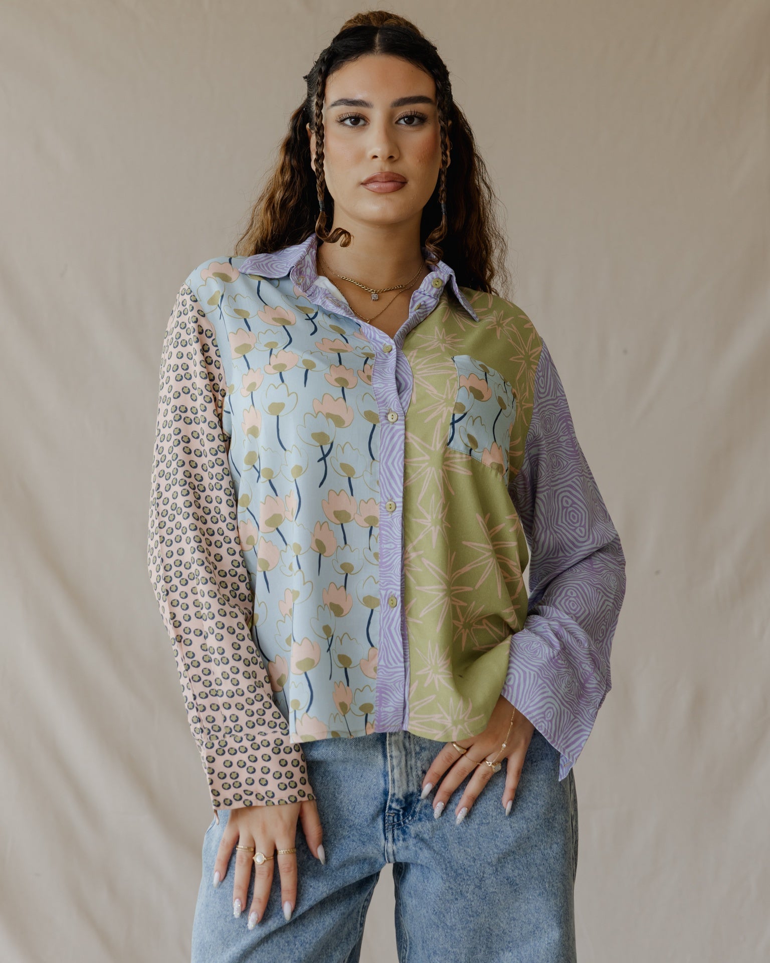 Flowy viscose shirt with a mix of playful prints and a relaxed fit. Lightweight and perfect for layering.
