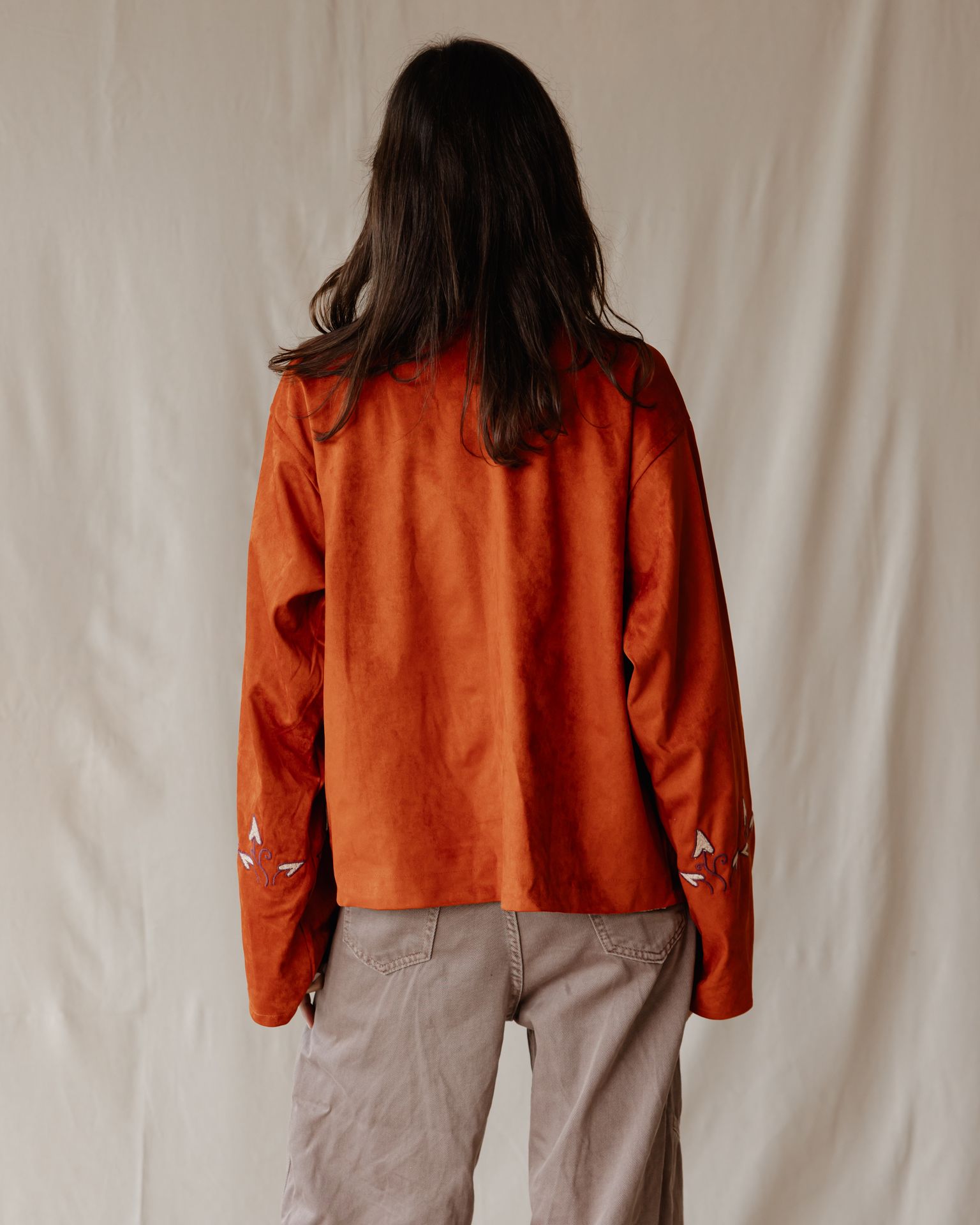 A soft suede-feel jacket featuring delicate floral embroidery. Lightweight, feminine, and effortlessly stylish—adds a warm, boho touch or a bold, eye-catching layer to any outfit.