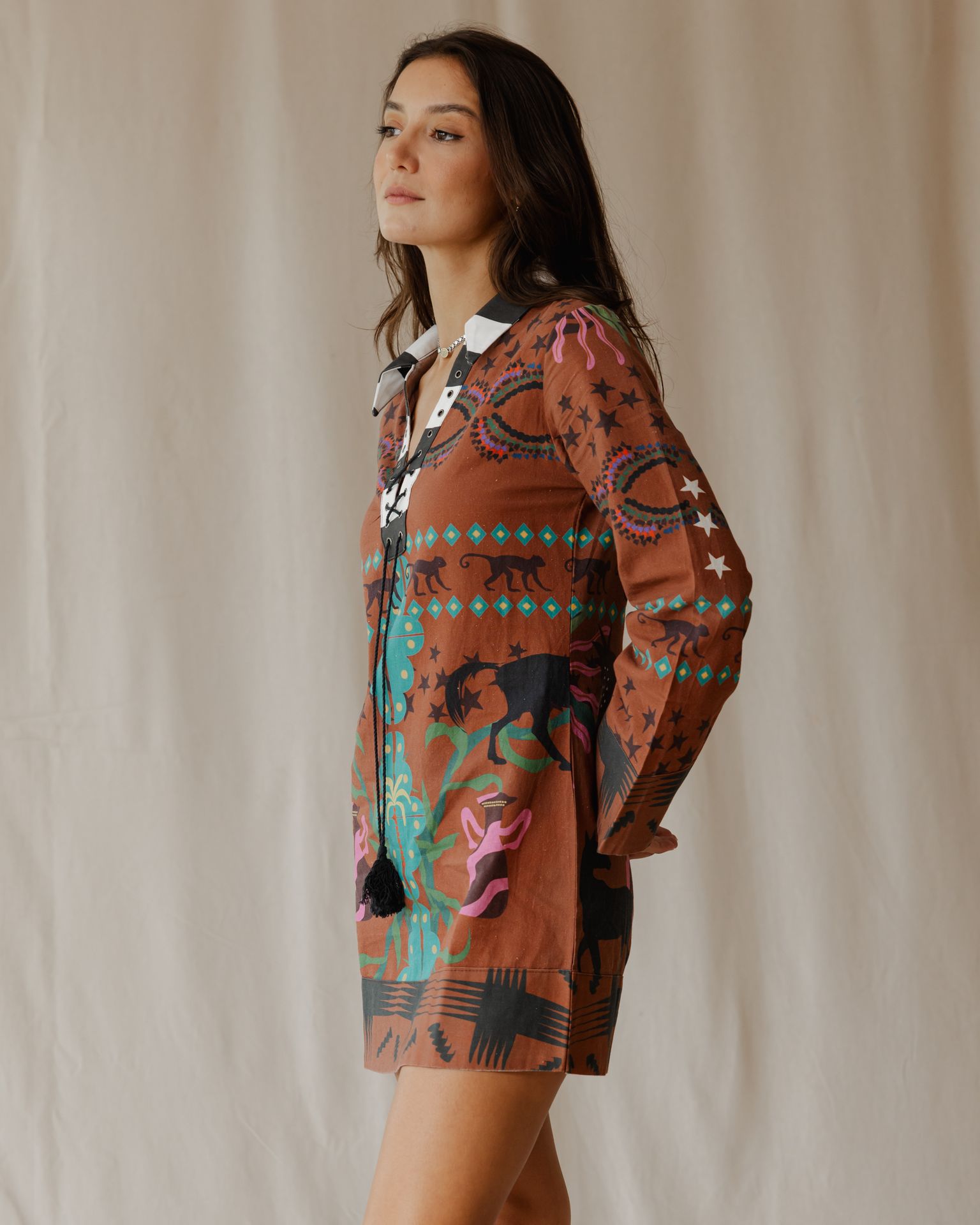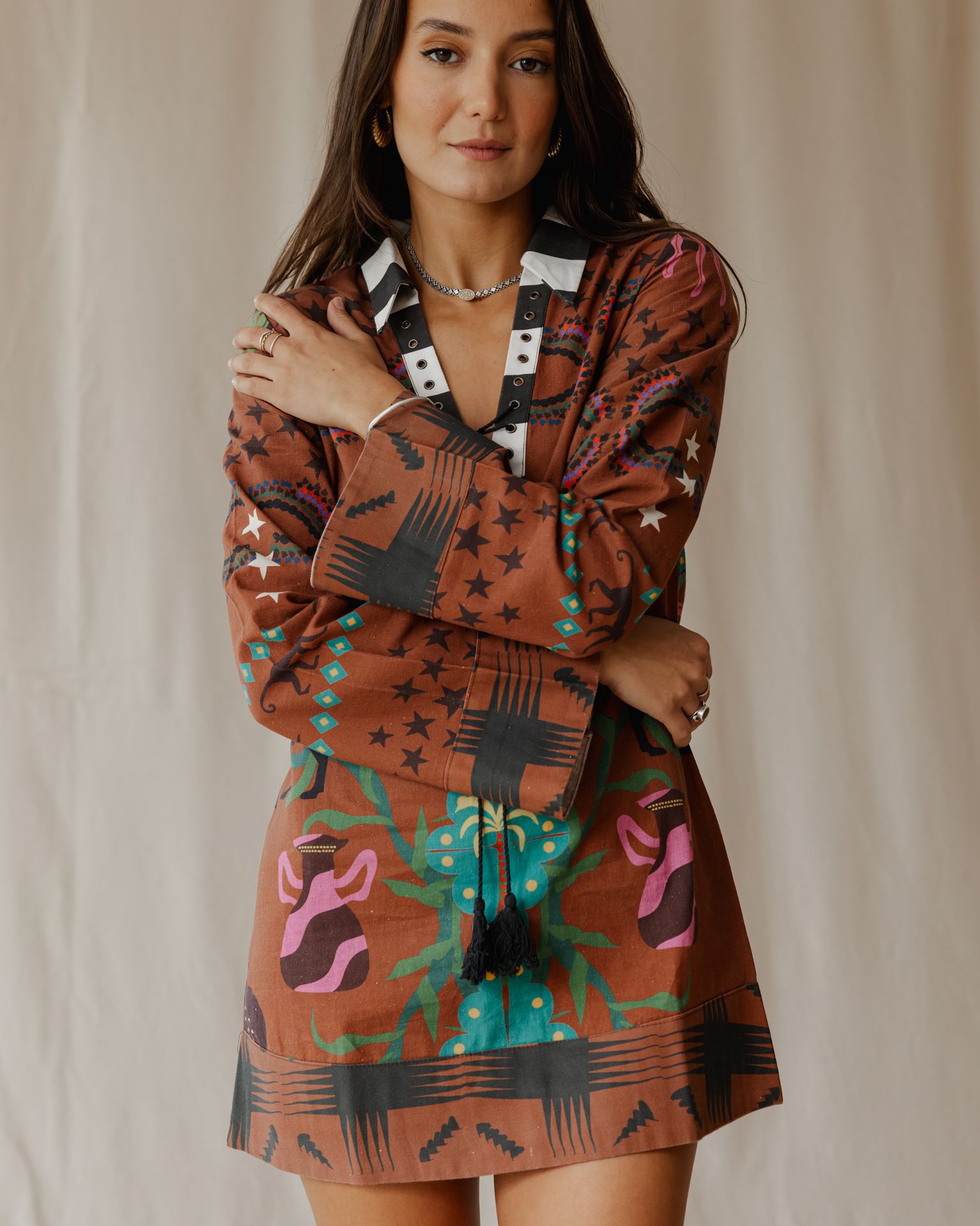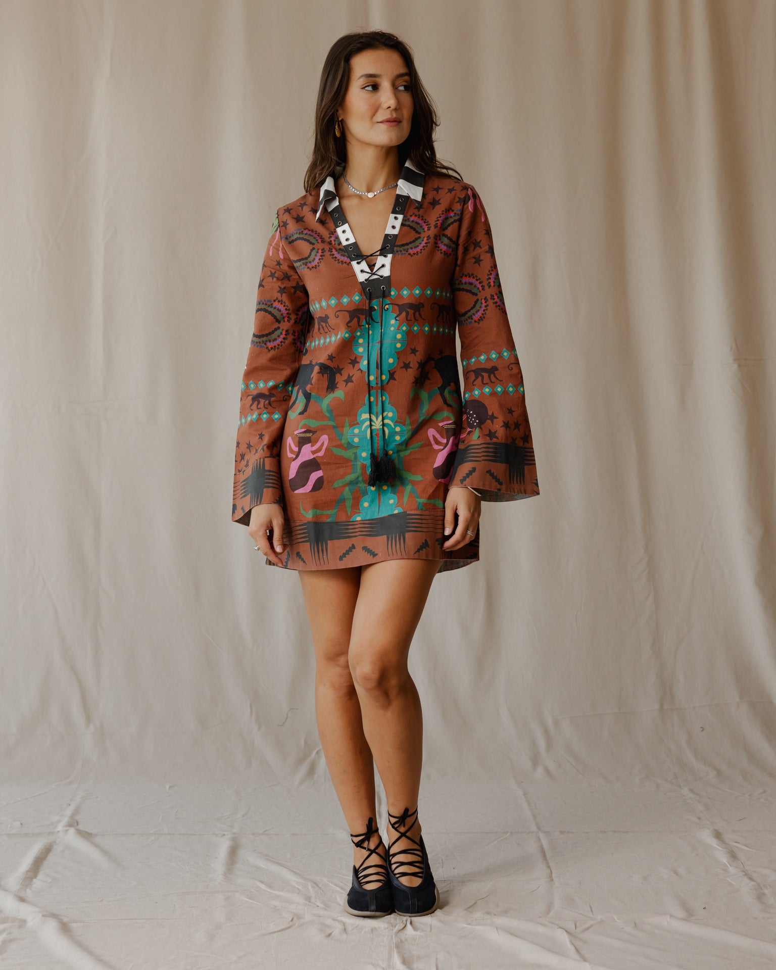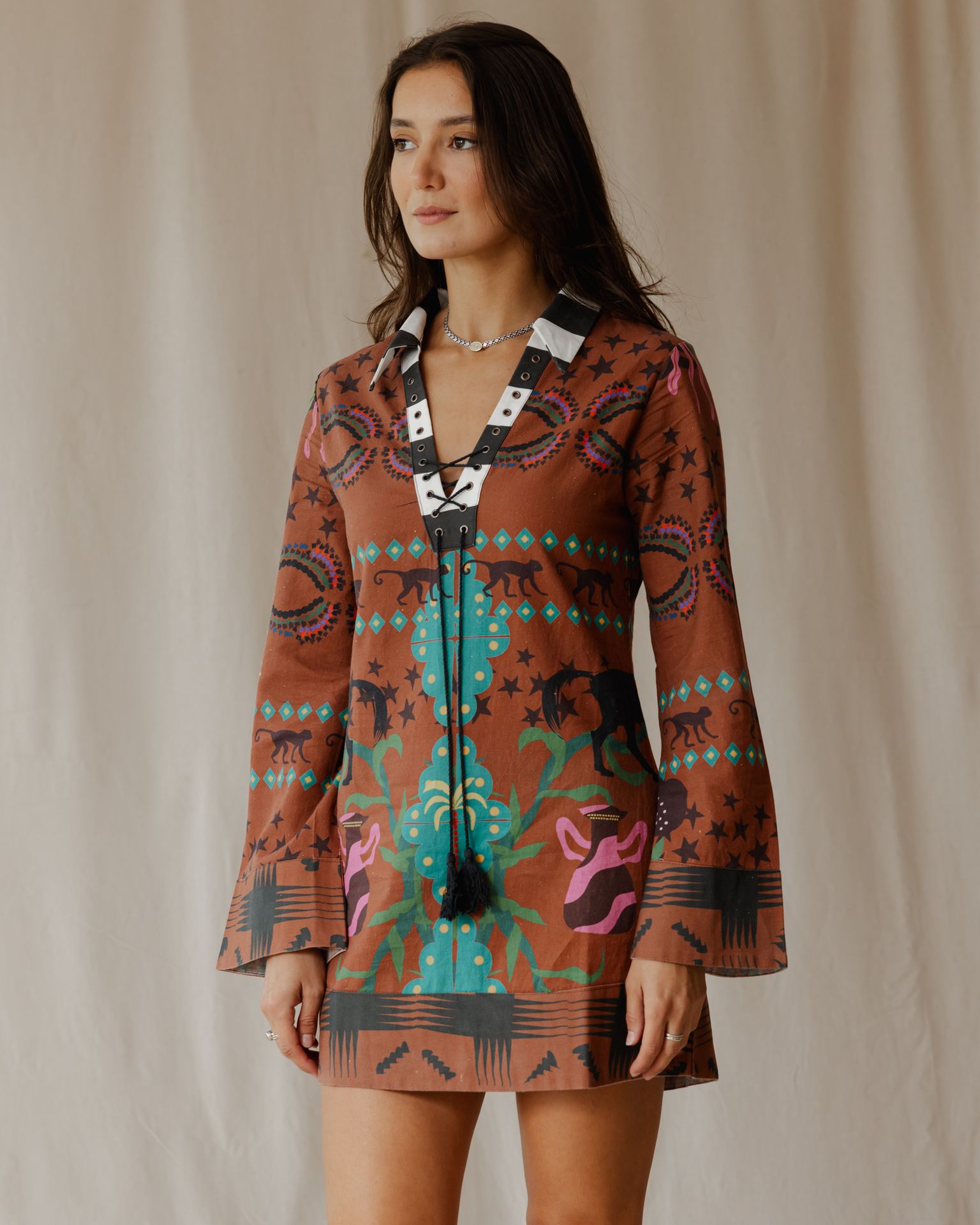 A breezy mini dress with colorful floral prints, long sleeves, and a lace-up neckline. Perfect for a relaxed yet stylish look.