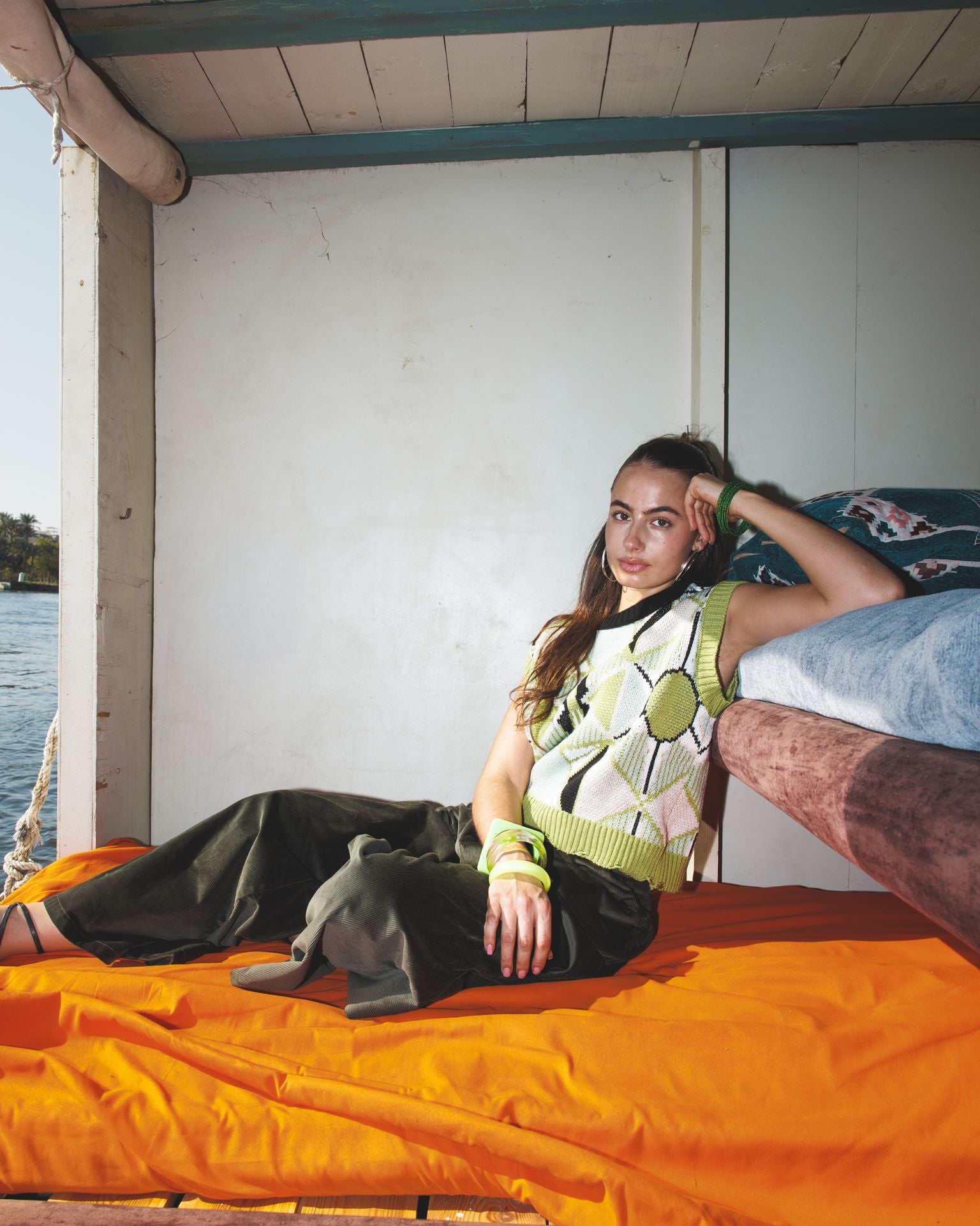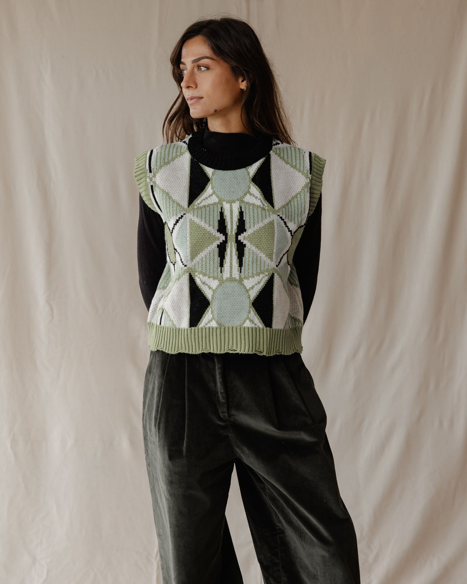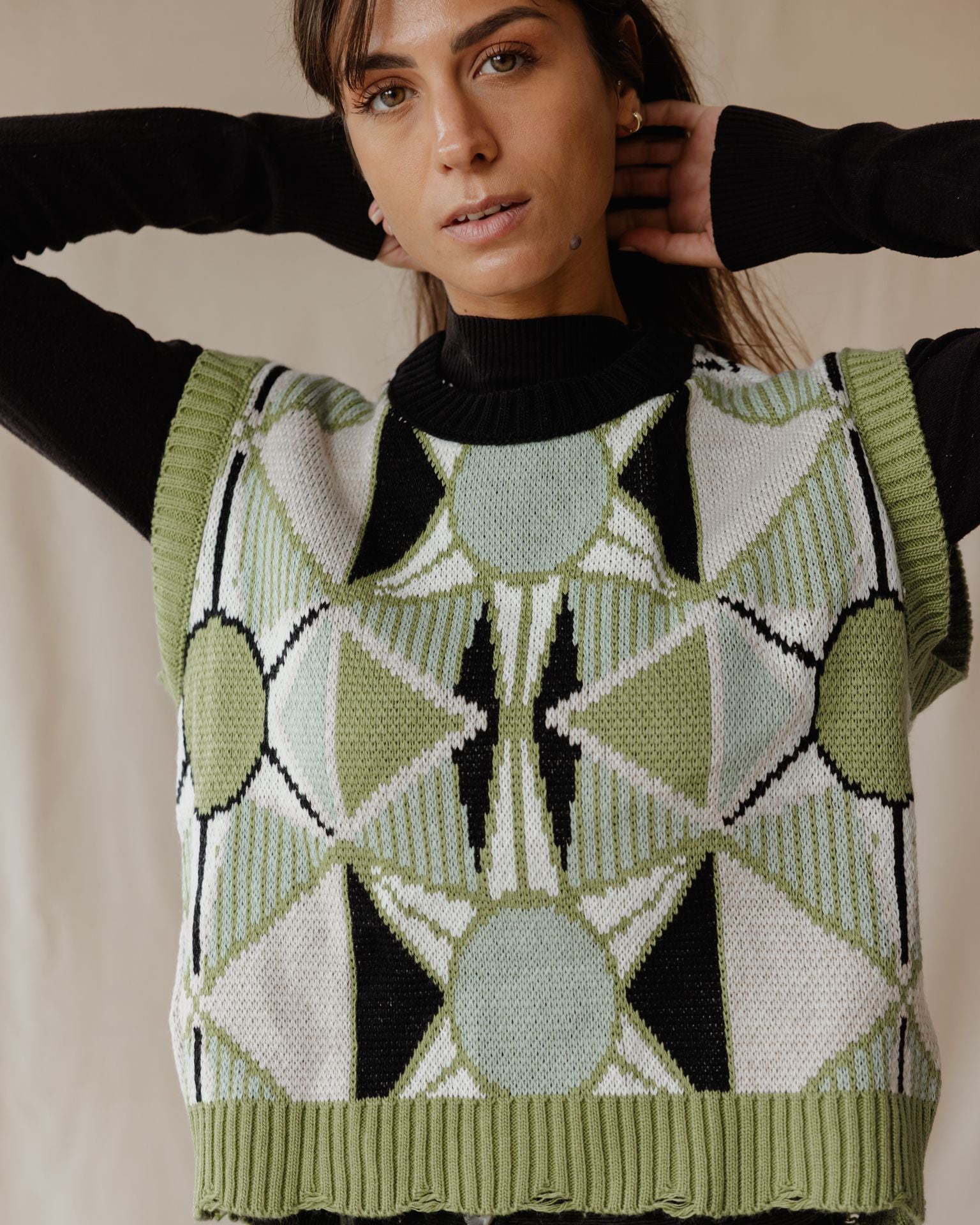 A chic, cropped knit vest featuring a striking, high-texture geometric pattern.