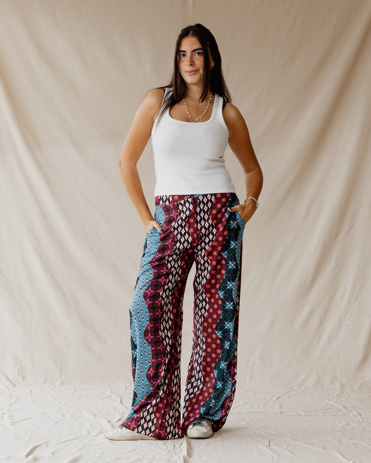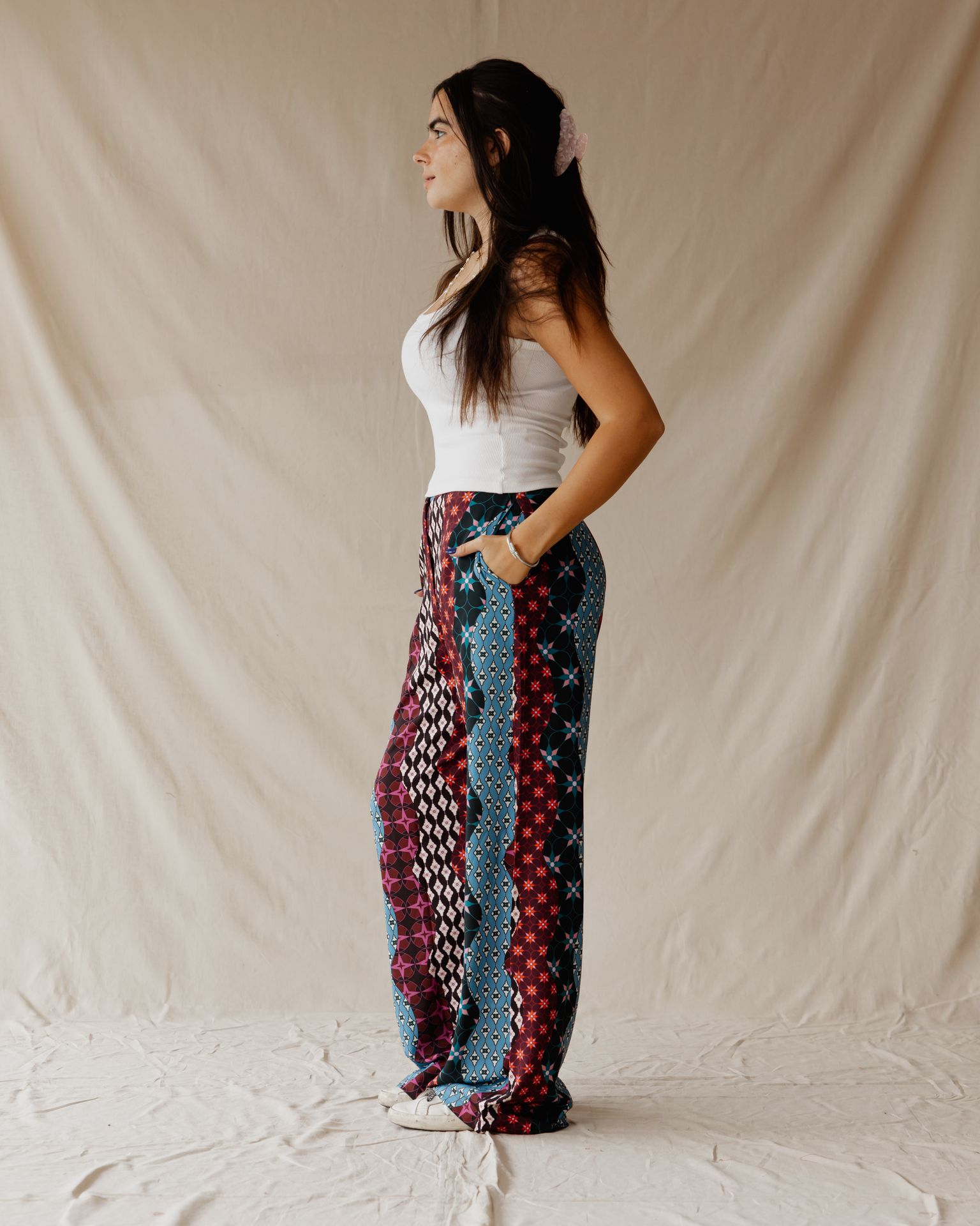 Effortlessly chic wide-leg pants with bold prints and a soft, flowy feel.