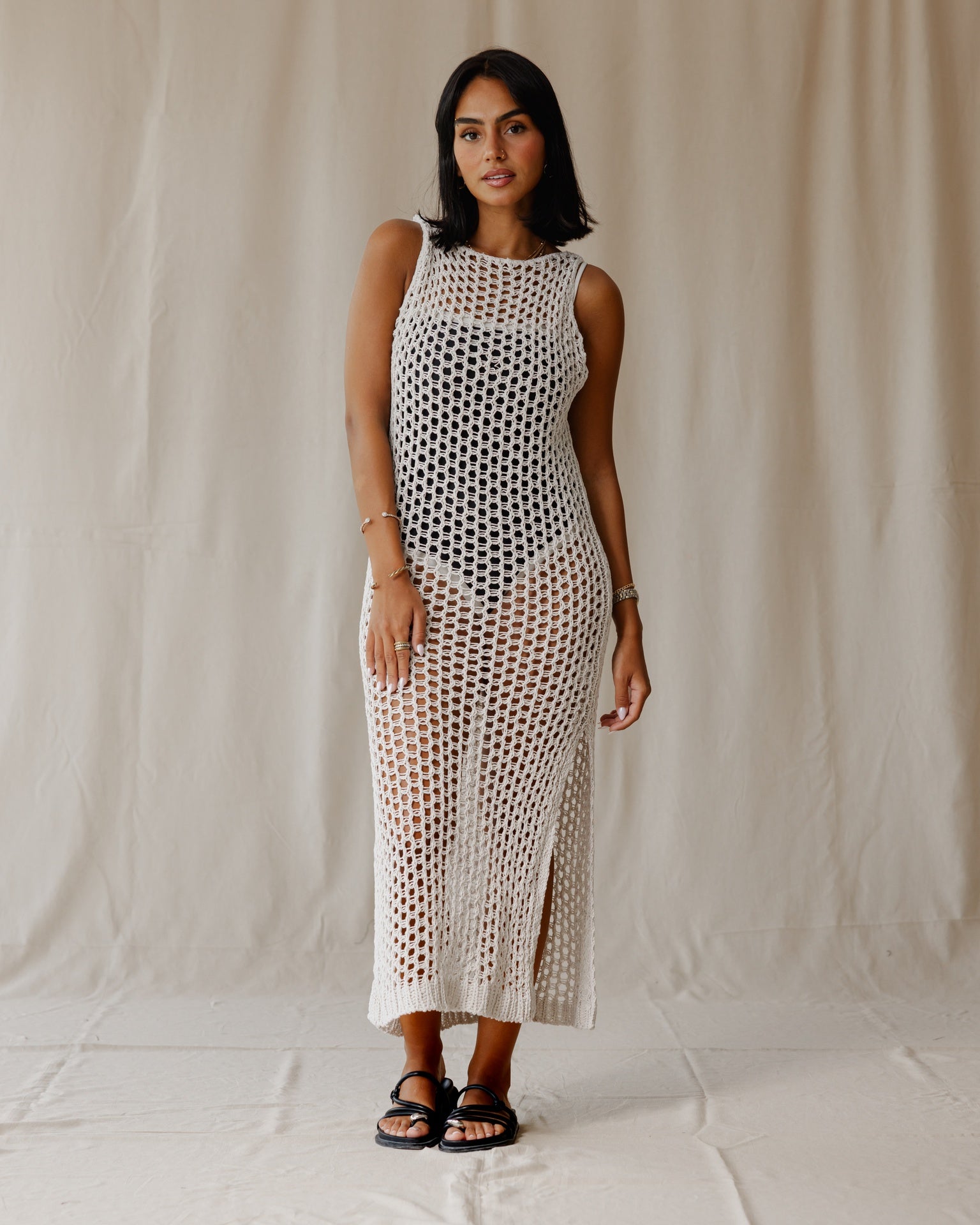 This stylish long crochet dress, featuring a breezy back opening, makes for a perfect and effortless summer cover-up.