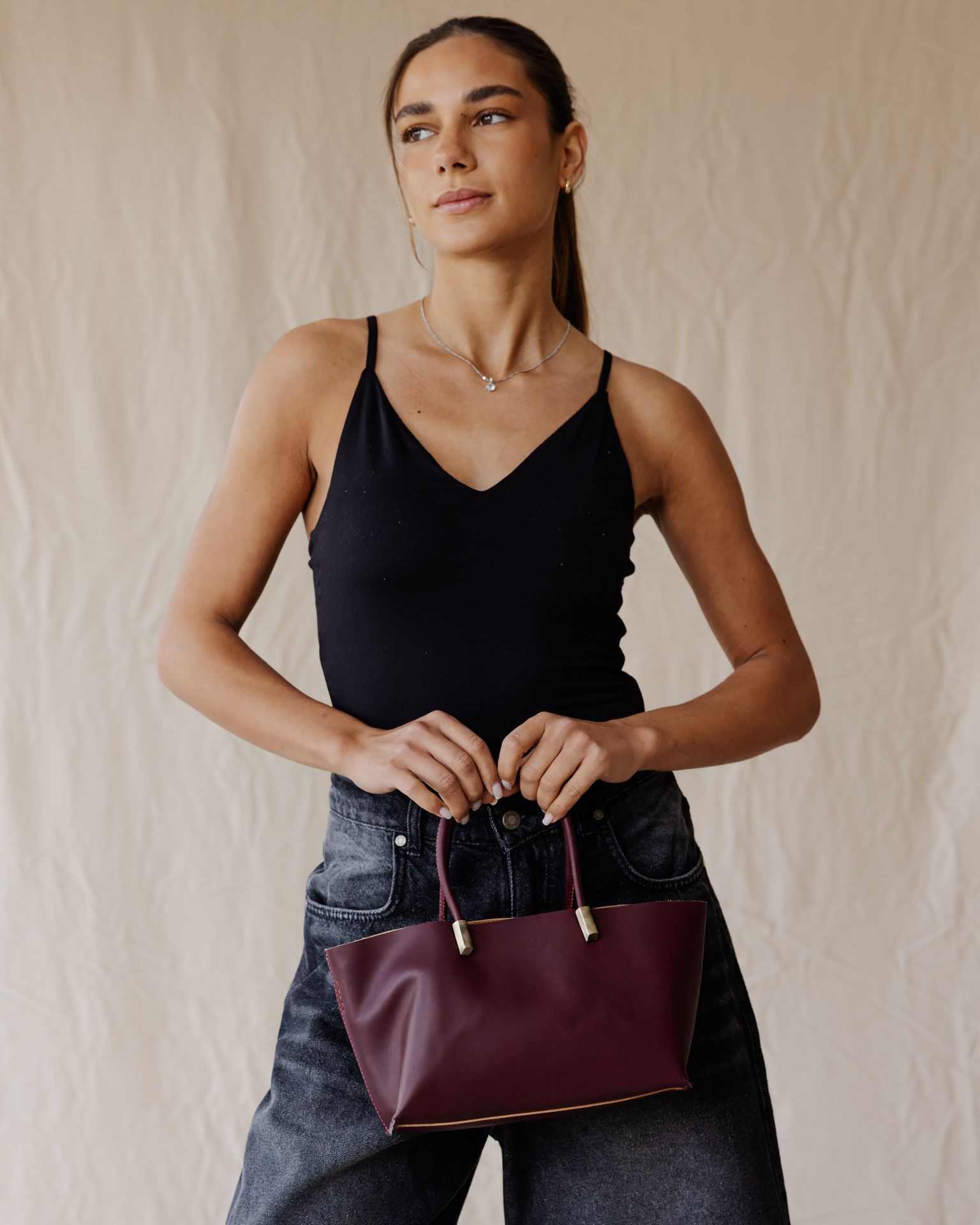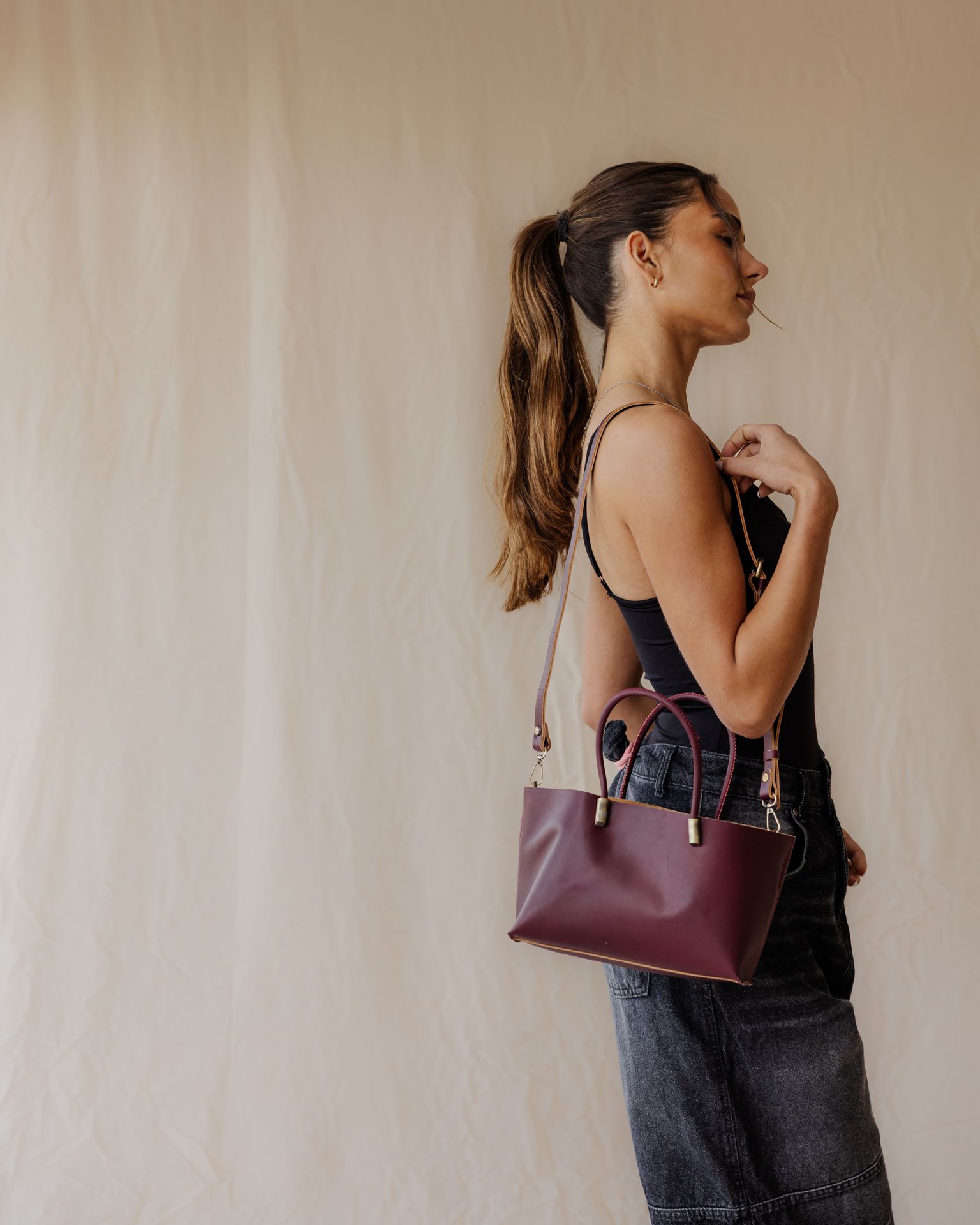 Designed with a structured shape and smooth leather texture, this bag offers top handles and a crossbody strap. Includes a practical inner pouch for easy organization.