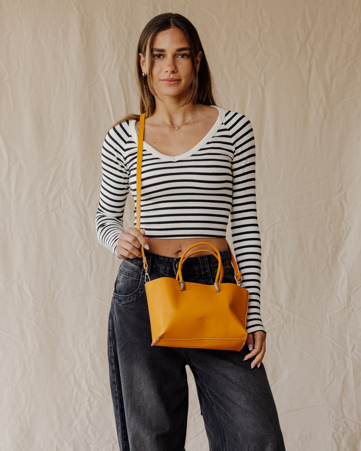 Designed with a structured shape and smooth leather texture, this bag offers top handles and a crossbody strap. Includes a practical inner pouch for easy organization.